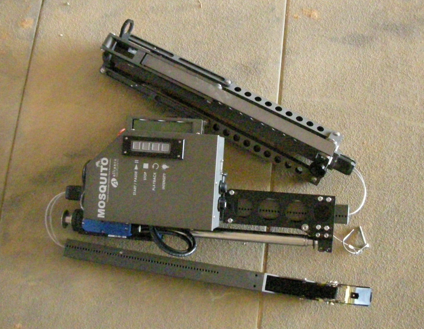 or either kind of strip encoder. We looked at optical laser mouse sensors but they are susceptible to dust, water and mud. Every string potentiometer that was light enough was also so flimsy the airmen assured us they would snap the thin steel cable. We tested an ultrasonic sonar device that was almost perfect but would occasionally flub a reading when we were pouring water over it. The method we settled on crossed from one segment to the next with ease, and worked even when we packed handfuls of mud on it.